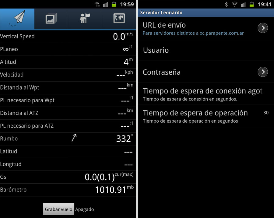 El sonido del vario se puede ajustar desde la configuración personalizada de la aplicación. Gaggle aprovecha la información generada por el sensor barométrico del Note para detallar con precisión la tasa de ascenso/descenso como cualquier otro variómetro tradicional que conocemos. También puede utilizarse en otros dispositivos Android descargándola desde el Google Market gratuitamente. La misma funcionará correctamente pero no contará con la información precisa del barómetro si el dispositivo no posee este sensor incoporado, como es el caso del Samsung Galaxy S2. También tendremos la configuración lista para poder subir los vuelos y compartirlos directamente en el ArgentinaXC con solo colocar nuestro nombre de usuario y clave.