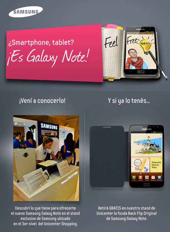 Información agregada el 13 de Marzo de 2012: Los usuarios de Galaxy Note ahora pueden visitar el stand de Samsung Argentina en Unicenter Shopping y con su Galaxy Note recibirán de regalo un protector/funda Galaxy Note Flip Cover, más info: http://www.galaxy-note.com.ar