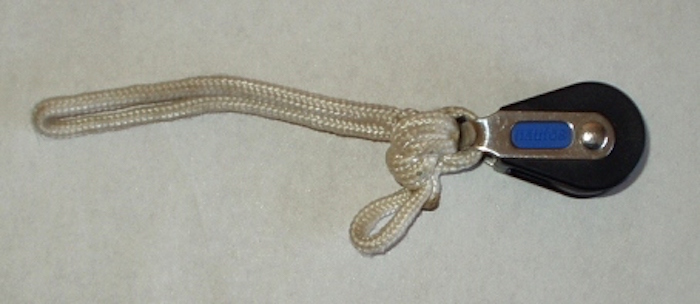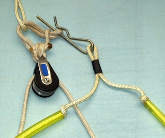 Como pueden ver es sumamente sencillo de fabricar y de bajo costo. No tiene ojales metálicos que se terminan rompiendo o lazos de soga que se descosen de las correas, etc. Es sumamente robusto y con unos 3 metros de soga de nylon de 4 o 5 mm de diámetro, medio metro de manguera fina, un pasador de acero y una roldada (si es náutica mejor), podemos fabricarlo. El modelo de la foto tiene los lazos cosidos con hilo encerado (tipo tiento), y terminados con espaguetis termocontraíbles, pero pueden hacerse unos simples nudos en su reemplazo.